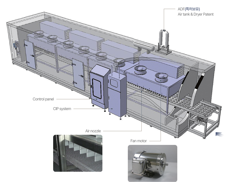 휀모터는 내부에 설치하고 위생을 위하여 SUS재질 바디를 사용한다.