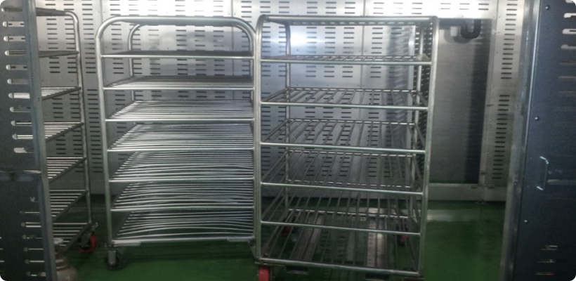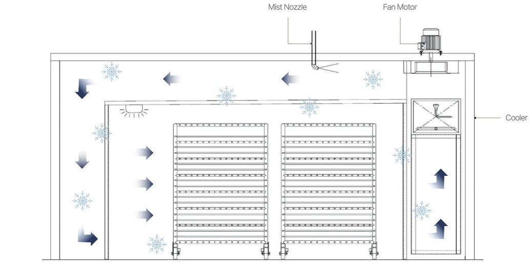 동결된 어류나 육류 등의 동결제품에 안개 형태로 분무되는 미스트 입자의 스팀을 순환 공급하여 제품을 고르게 해동하는 장치로 대차를 사용하여 대용량 처리가 가능하고,
